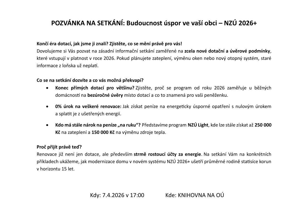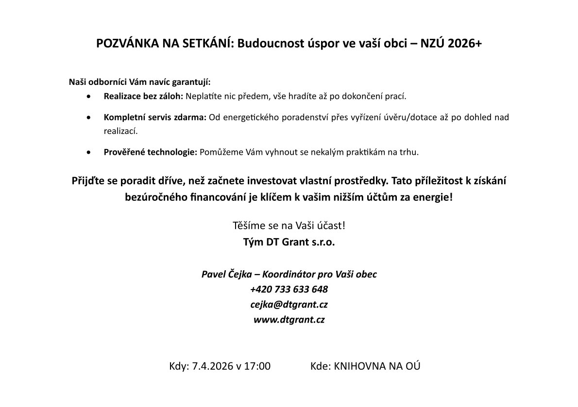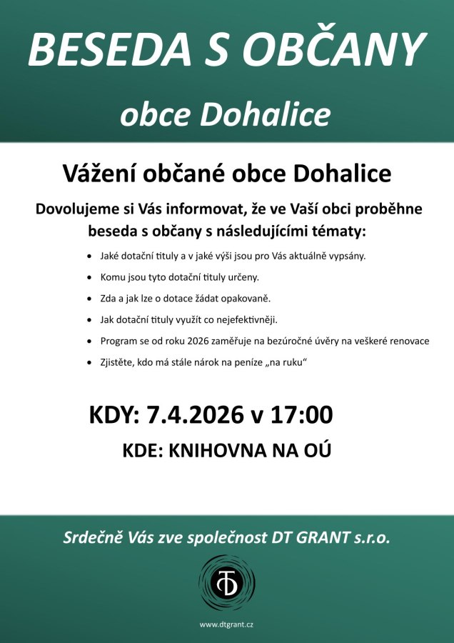 Společnost DT GRANT Vás zve 7. 4. 2026 od 17:00 do obecní knihovny na besedu o současné situaci v dotačních a úvěrových možnostech při renovaci rodinných domů.