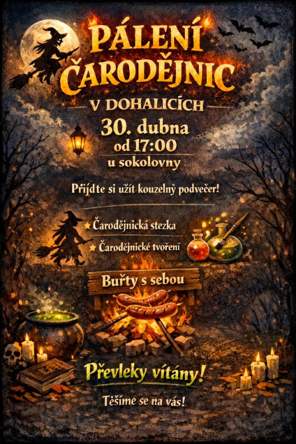 Společně s TJ Sokol Dohalice vás zveme na tradiční pálení čarodějnic u sokolovny. Začátek v 17:00, buřty a převleky s sebou. Na děti čeká čarodějnická stezka a tvoření.