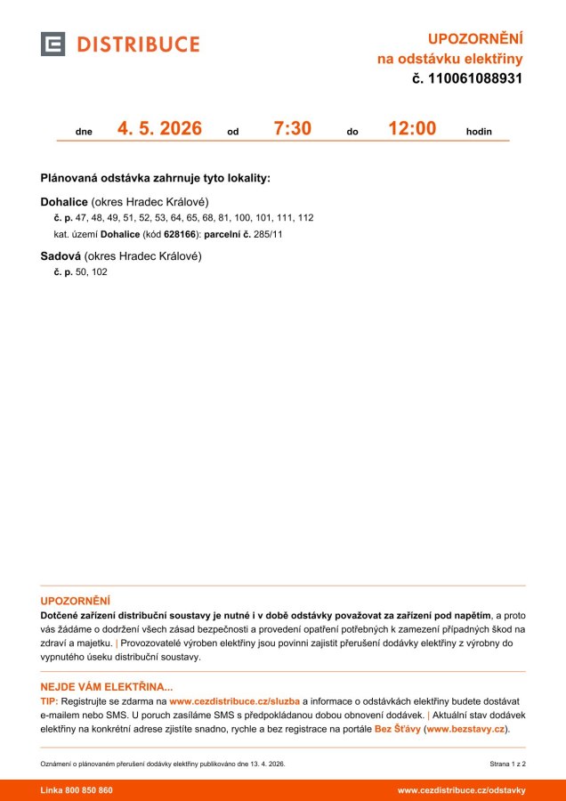 ČEZ distribuce oznamuje planovanou odstávku elektřiny dne 4. 5. 2026 od 07:30 do 12:00 v části naší obce.
