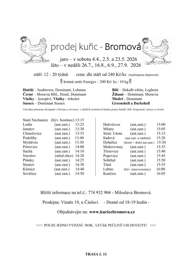 Firma Bromová bude prodávat v sobotu 4. 4., 2. 5. a 23. 5. u horní a dolní autobusové zastávky v 15:30 hod. slepice různých barev. Cena od 240,- Kč/kus dle stáří kuřic.